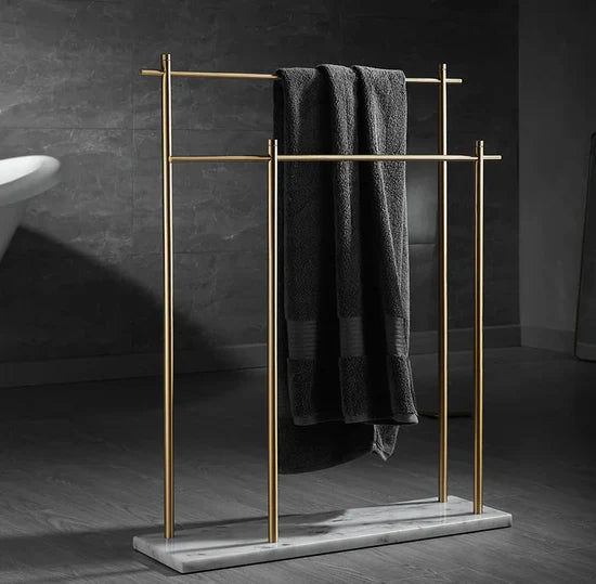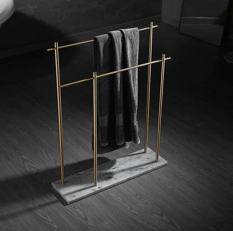 Apportez une touche d’élégance à votre salle de bain avec ce porte-serviettes design en métal doré et base en effet marbre. Son look raffiné et contemporain allie fonctionnalité et décoration haut de gamme.