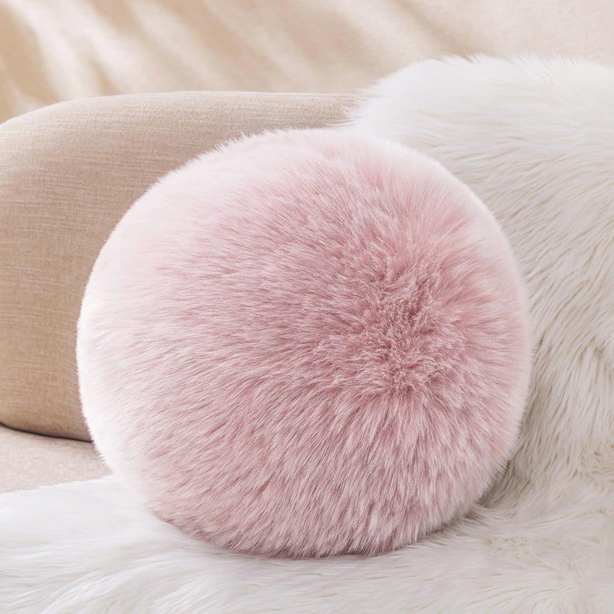 ✨ Coussin Rond en Fausse Fourrure – Rose Poudré ✨